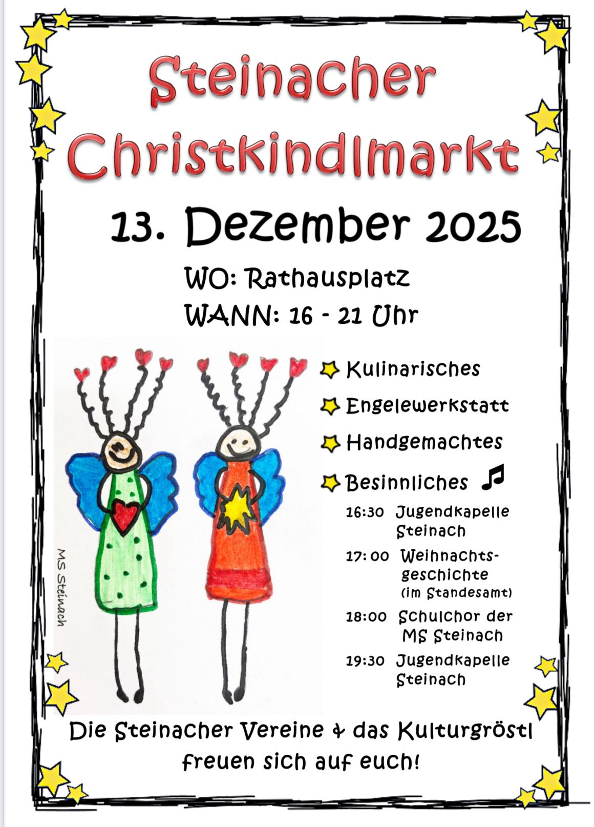 Wir betreuen heuer beim Steinacher Christkindlmarkt das Cafe in der Seniorenstube. Es gibt Kaffee und Kuchen, natürlich auch Wein und Bier zu genießen.