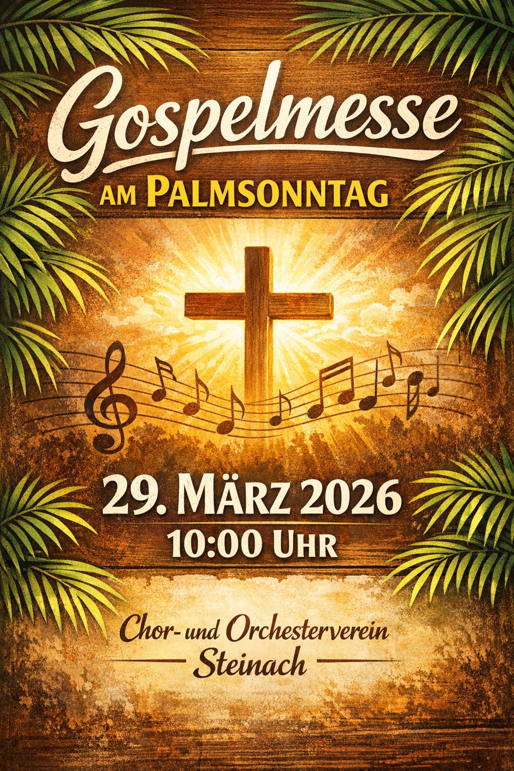 Dienstag, 24. März 2026: 19:40 Uhr Einsingen im Probelokal, 20:00 Uhr Generalprobe für Palmsonntag in der Kirche. Bitte verlässlich und pünktlich kommen! Am Dienstag, 31. März 2026 Generalprobe für den Ostersonntag.