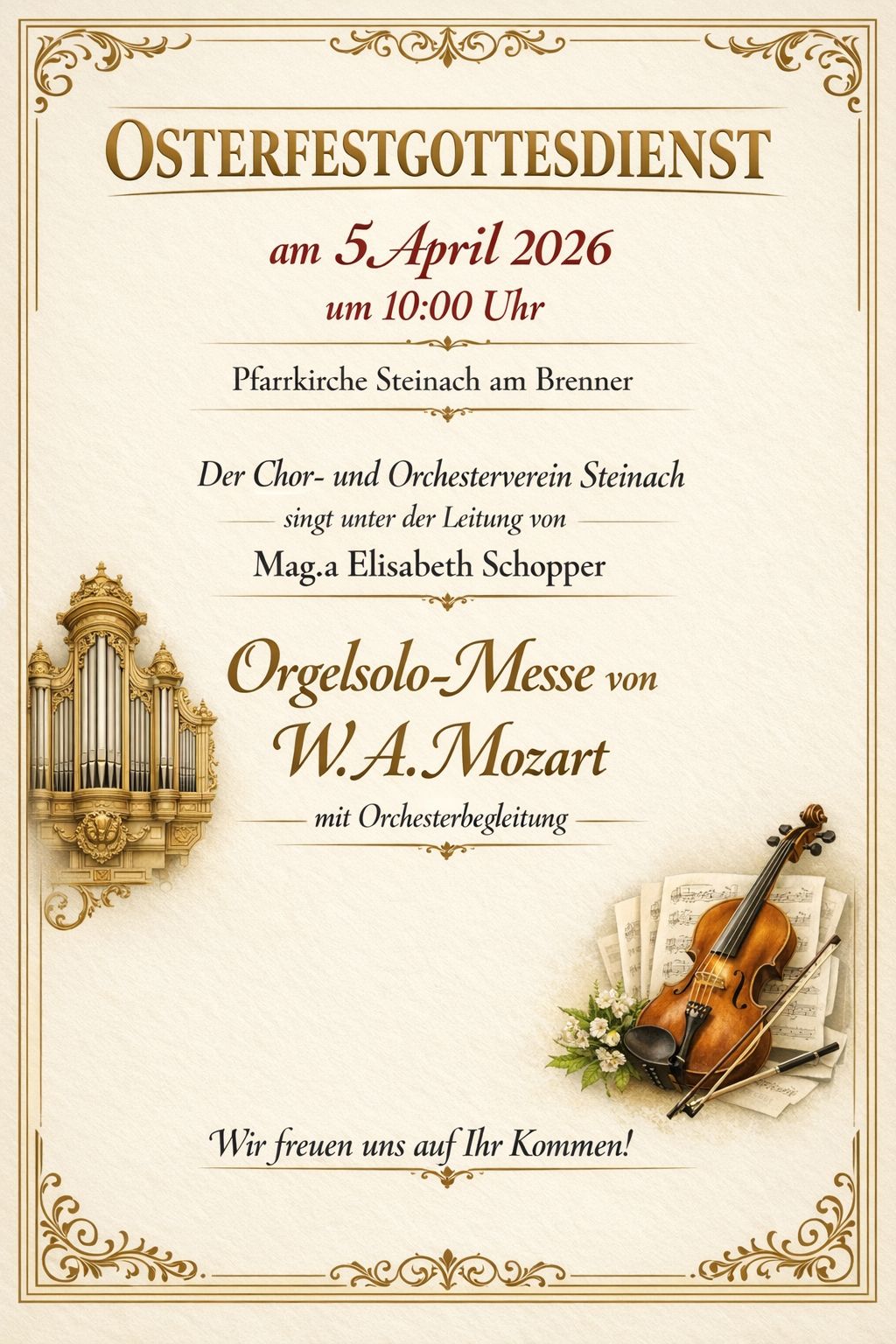Bei der Festmesse am Ostersonntag singen wir die Orgelsolo-Messe von W. A. Mozart mit Orchesterbegleitung.
